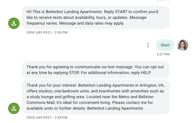 Users interact with the BetterBot chatbot on property websites or third-party listing platforms. When a user requests information, the chatbot collects their contact details and presents the following opt-in message: "BetterBot: By clicking 'Yes, I Consent,' you agree to receive SMS messages about your property inquiry, including appointment confirmations and follow-ups. Message frequency varies. Message and data rates may apply. Reply STOP to unsubscribe. See our Privacy Policy.